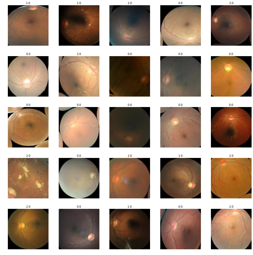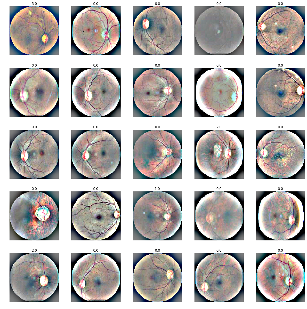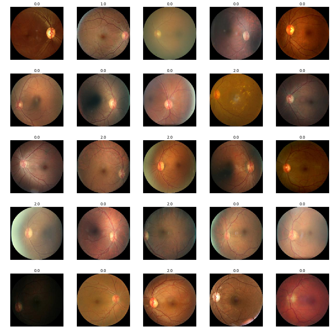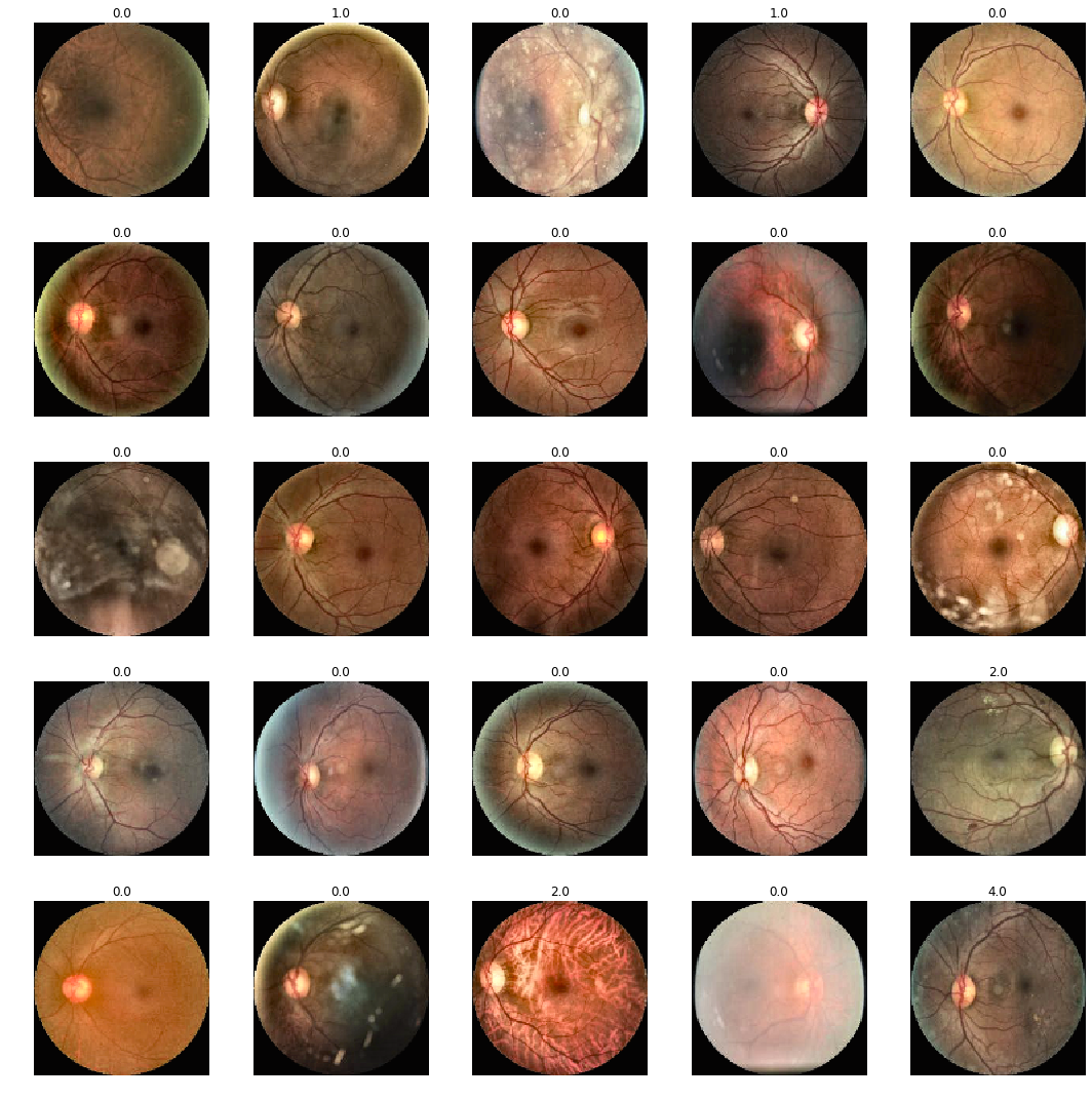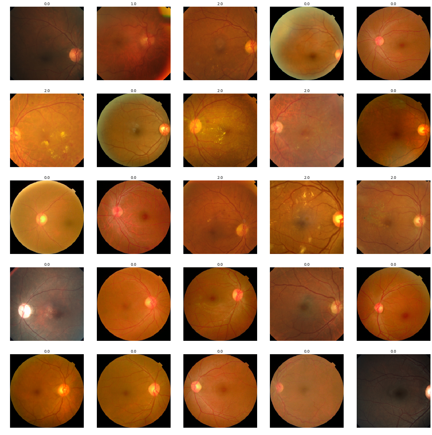 class Experiment():def__init__(self, name, data_source, arch, image_size, bs, wd, use_xtra_tfms, oversample, pretrained_model_name=None):super().__init__()self.name = nameself.data_source = data_sourceself.arch = archself.image_size = image_sizeself.bs = bsself.wd = wdself.use_xtra_tfms = use_xtra_tfmsself.oversample = oversampleself.pretrained_model_name = pretrained_model_nameself.data_in_use, self.base_dir, self.train_img_path, self.test_img_path, self.df_train =self.data_sourceifself.pretrained_model_name:self.learner, self.data_bunch = get_learner_and_databunch(self.arch, self.data_source, image_size=self.image_size, bs=self.bs, use_xtra_tfms=self.use_xtra_tfms, oversample=self.oversample)print(f'Loading pretrained model: {self.pretrained_model_name}')self.learner.load(self.base_dir +self.pretrained_model_name)self.learner.to_fp16()else:self.learner, self.data_bunch = get_learner_and_databunch(self.arch, self.data_source, image_size=self.image_size, bs=self.bs, use_xtra_tfms=self.use_xtra_tfms, oversample=self.oversample)def find_lr(self):# find the inital lr for frozen trainingself.learner.lr_find(wd=self.wd)self.learner.recorder.plot(suggestion=True)def fit_frozen(self, epochs, lr):self.learner.fit_one_cycle( epochs, lr, wd=self.wd, callbacks=[SaveModelCallback(self.learner, monitor='valid_loss', name=f'best_{self.name}')])%notify -m "fit_one_cycle finished"print(f'Saved model: {self.base_dir +self.name}')self.learner.save(self.base_dir +self.name)def unfreeze(self):self.learner.unfreeze()self.learner.lr_find()self.learner.recorder.plot()def fit_unfrozen(self, epochs, lr):self.learner.fit_one_cycle( epochs, lr, wd=self.wd, callbacks=[SaveModelCallback(exp.learner, monitor='valid_loss', name=f'best_unf_{exp.name}')])%notify -m "unfrozen fit_one_cycle finished"self.learner.save(self.base_dir +'unf_'+self.name)print(f'Saved model: {self.base_dir +"unf_"+self.name}')def load_frozen(self):self.learner.load(self.base_dir +self.name)self.learner.to_fp16()def load_best_frozen(self):self.learner.load(self.train_img_path +'models/best_'+self.name)self.learner.to_fp16()print(f'Loaded best model {self.train_img_path +"models/best_"+self.name}')def get_kappa_score(self): get_kappa_score(self.learner)def show_batch(self):self.data_bunch.show_batch(4, figsize=(20,20))# This method is a helper method that we use to help us setup a learner and a databunch with baselined defaults# It returns the learner, the data bunch, and also runs an lr finder to use to find an appropriate learning rate to feed into fit one cycle# The only required parameter is the architecture. For everything else # you can pass in overrides values to test different hyperparametersdef get_learner_and_databunch( arch, data_source, image_size=128, bs=64, use_xtra_tfms=False, oversample=False):# data bunch data_bunch = get_data_bunch( data_source, image_size, bs=bs, use_xtra_tfms=use_xtra_tfms)# create a learner learner = get_cnn_learner(arch, data_bunch, oversample=oversample) return (learner, data_bunch)def get_kappa_score(learner): preds, y = learner.get_preds() score = quadratic_kappa(preds, y)print('Kappa score is {0}'.format(score))return score